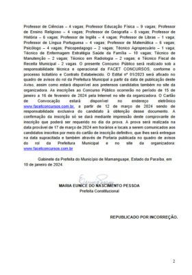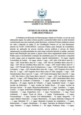 O concurso da Prefeitura Municipal de Mamanguape, no Litoral Norte do estado, terá as inscrições abertas na próxima segunda-feira (15). Conforme apurou o ClickPB, a informação foi publicada em documento do último dia 10, assinado pela gestora do município Eunice Pessoa (PSB).