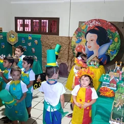 O evento não se limitou à mostra de trabalhos. As fotos também registraram a emocionante apresentação dos alunos, que vestiram figurinos temáticos inspirados nos contos, como anões e palhacinhos. A apresentação ao ar livre, com as crianças alinhadas e sorrindo, foi o ápice das celebrações, enchendo de orgulho a comunidade.